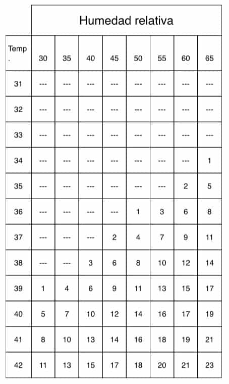 A la izquierda la columna de temperatura y la primera fila la humedad relativa. Con estos dos datos se establecen los minutos de descanso por hora en zonas con climatización